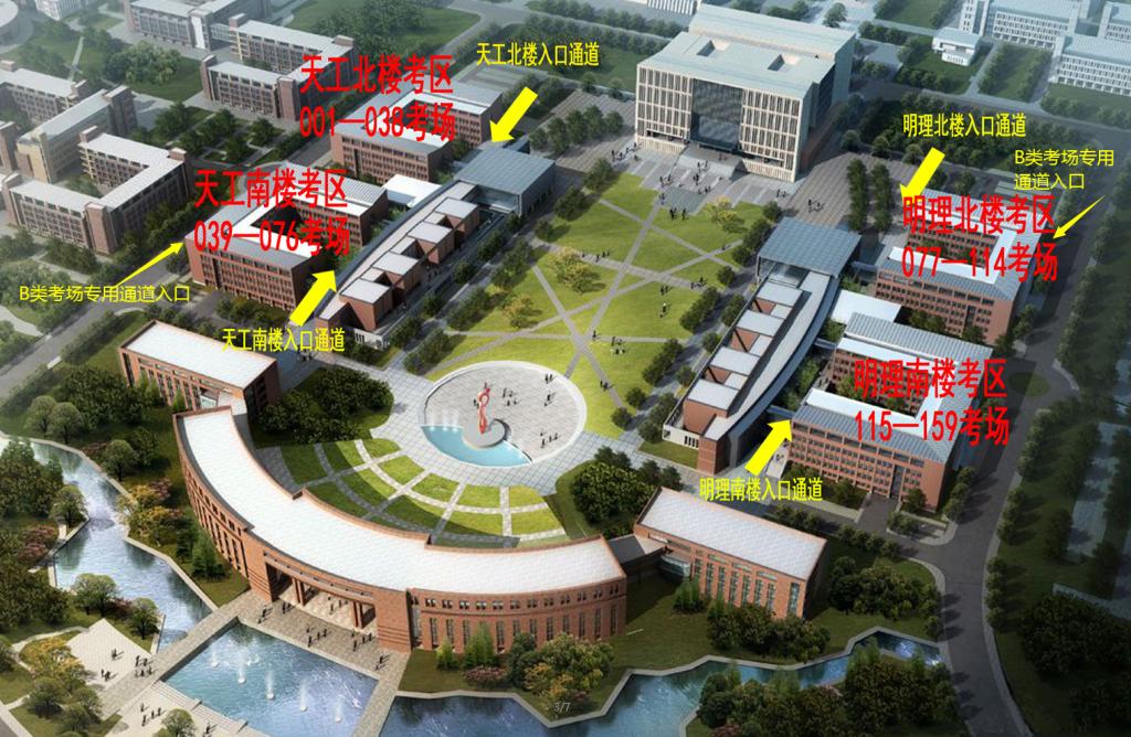 安排在B类考场考生须从明理北楼东门、天工南楼西门的专用通道(门口有标识)进入考场。