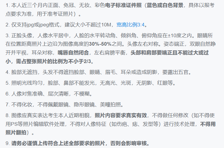 证件照用于准考证照片以及公安部门照片比对等,请考生务必按照网上确认系统的证件照上传要求提供照片,以免影响审核结果。