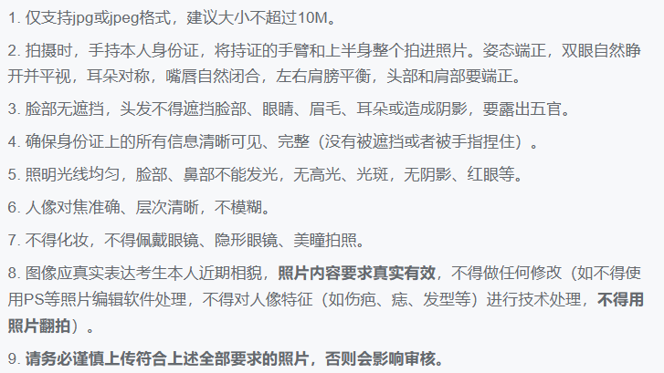 2.上传的证件照片务必是本人近期正面免冠照片,需客观反映本人近期真实面貌,不得化妆、P图,否则审核不通过。